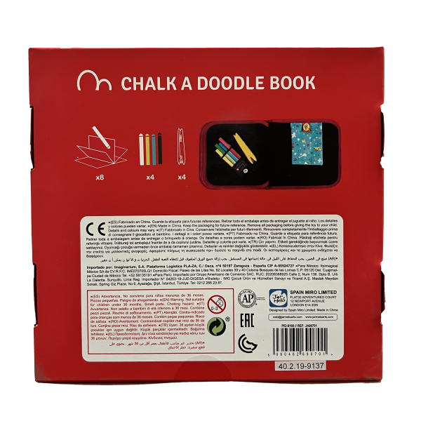 Incluye 8 páginas, 4 tizas de colores que no generan polvo y un bolsillo de tiza en la última página del libro.