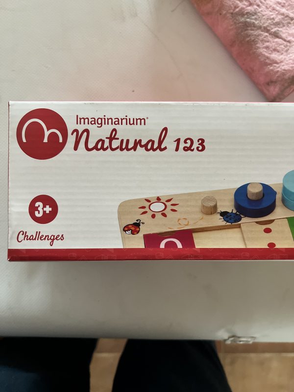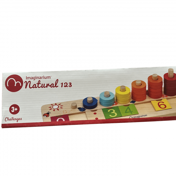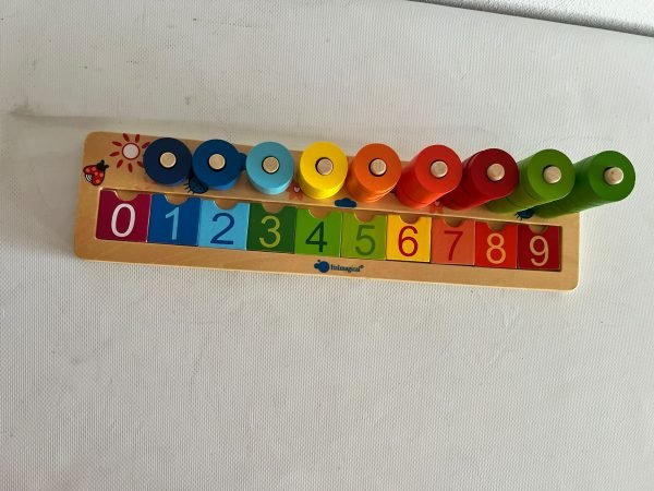 Juguete de madera para aprender números y contar. 45 anillos de colores. 9 palos y 10 tarjetas con números del 0 al 9.