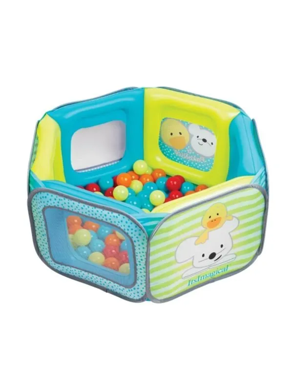 Con 100 bolas de colores que estimulan el juego y el desarrollo psicomotor.