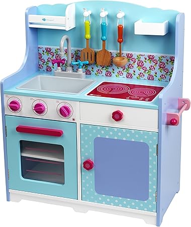 Cocina de madera completa con vitrocerámica, fregadero, horno, armarios y utensilios de cocina.